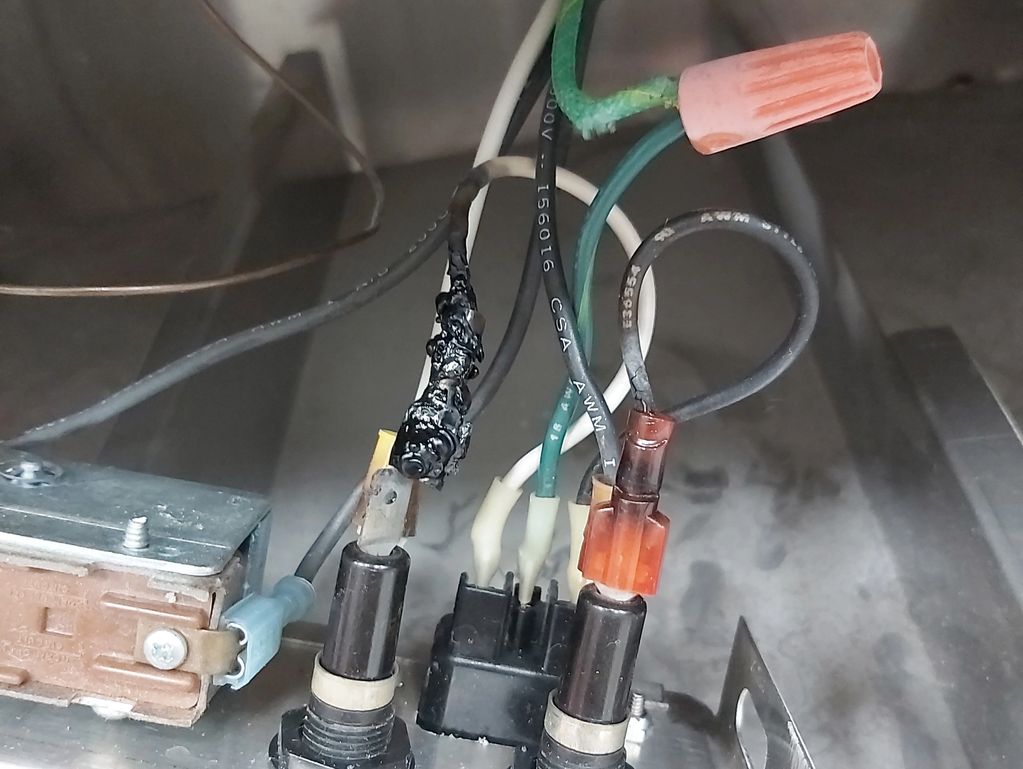 This hydrocollator had gone through multiple cycles of heating and cooling which caused the connection to slowly creep off the spade connector. As you can see, the result was ugly (and stinky).